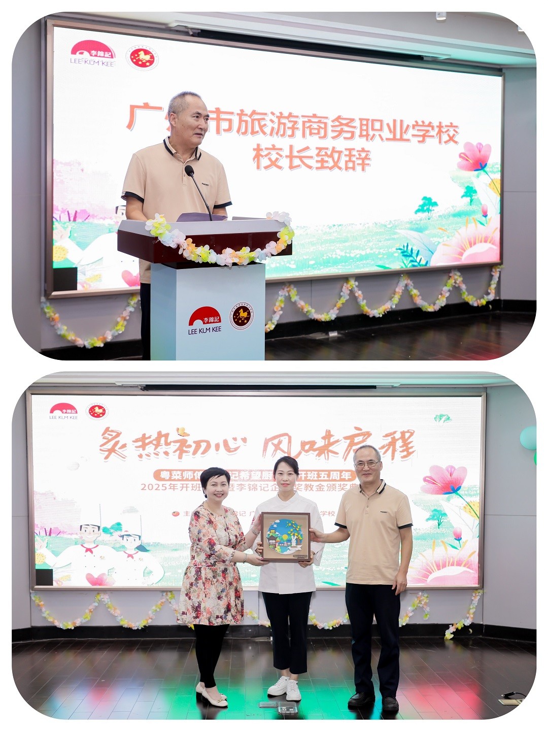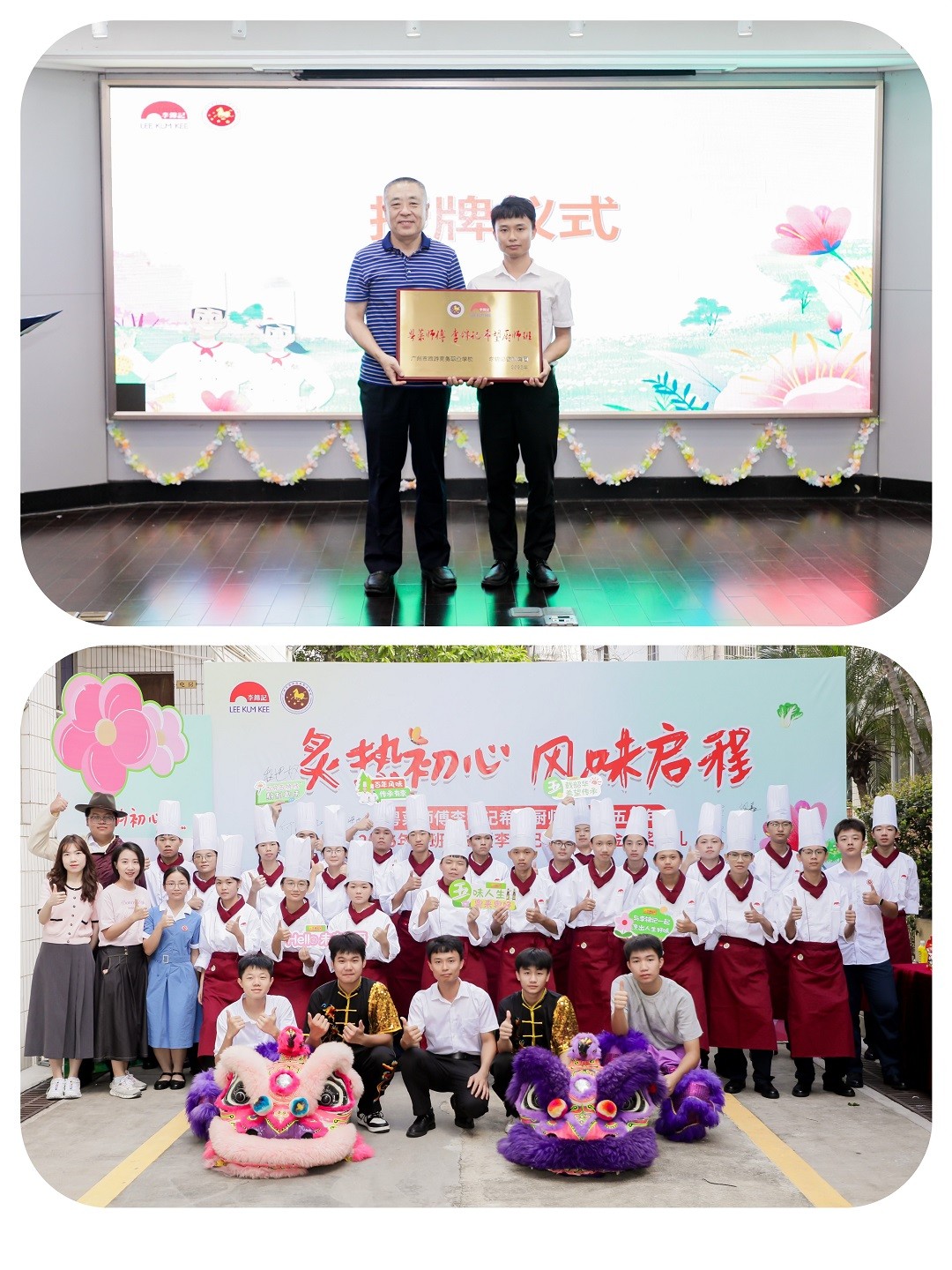 广州市旅游商务职业学校党委书记王勇(上图左)为2025级粤菜师傅李锦记希望厨师班班主任吴长喜(上图右)授予班级牌匾