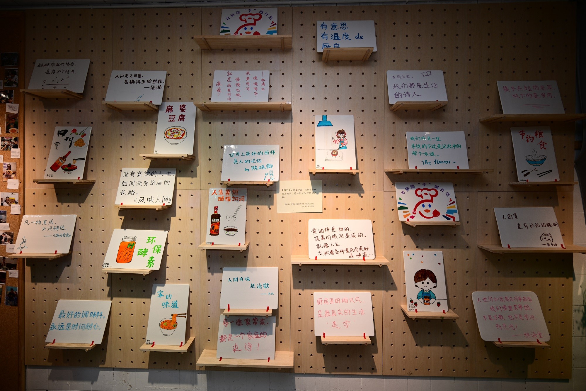 这些是李锦记希望厨师们悟出的关于厨房的哲学,而更多名人也曾留下不少关于厨师的哲学文字,它们被可持续“李”想计划筛选出来,由李锦记希望厨师用果酱写在盘子上。那些有意思的厨房中的场景,也被画在盘子上——这些文字、图画都被陈列在整面墙上,以此唤醒人们重新审视自己与厨房的关系,重新珍视发生在厨房中的情。