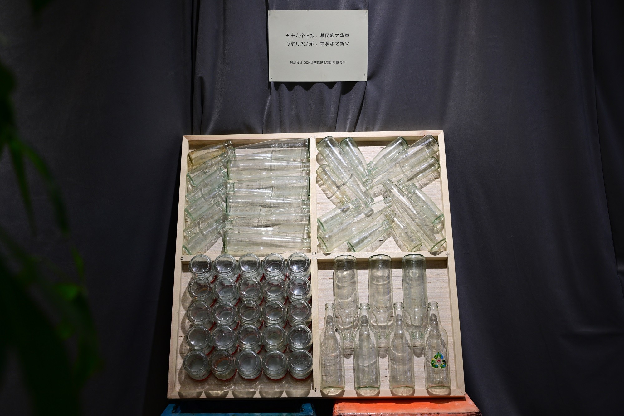 而承载着厨房百味的酱料玻璃瓶,在可持续“李”想计划的改造下,有的成了装有盛开玫瑰的花瓶,点缀了“餐桌”,增添了一味浪漫;有的成了一枚蜡烛,温暖了“餐桌”,增添了一度温暖。“这个玻璃瓶的大木框挺有意思的。”观看展览的居民大多数都要停下脚步,指着立在板凳上的木框发出感慨——这是由56个李锦记的废弃酱料玻璃瓶组合而成的艺术装置,代表着56个民族,也蕴含着辽阔丰富的中华优秀饮食文化,在万家灯火的流转中,续写“李”想新篇章。