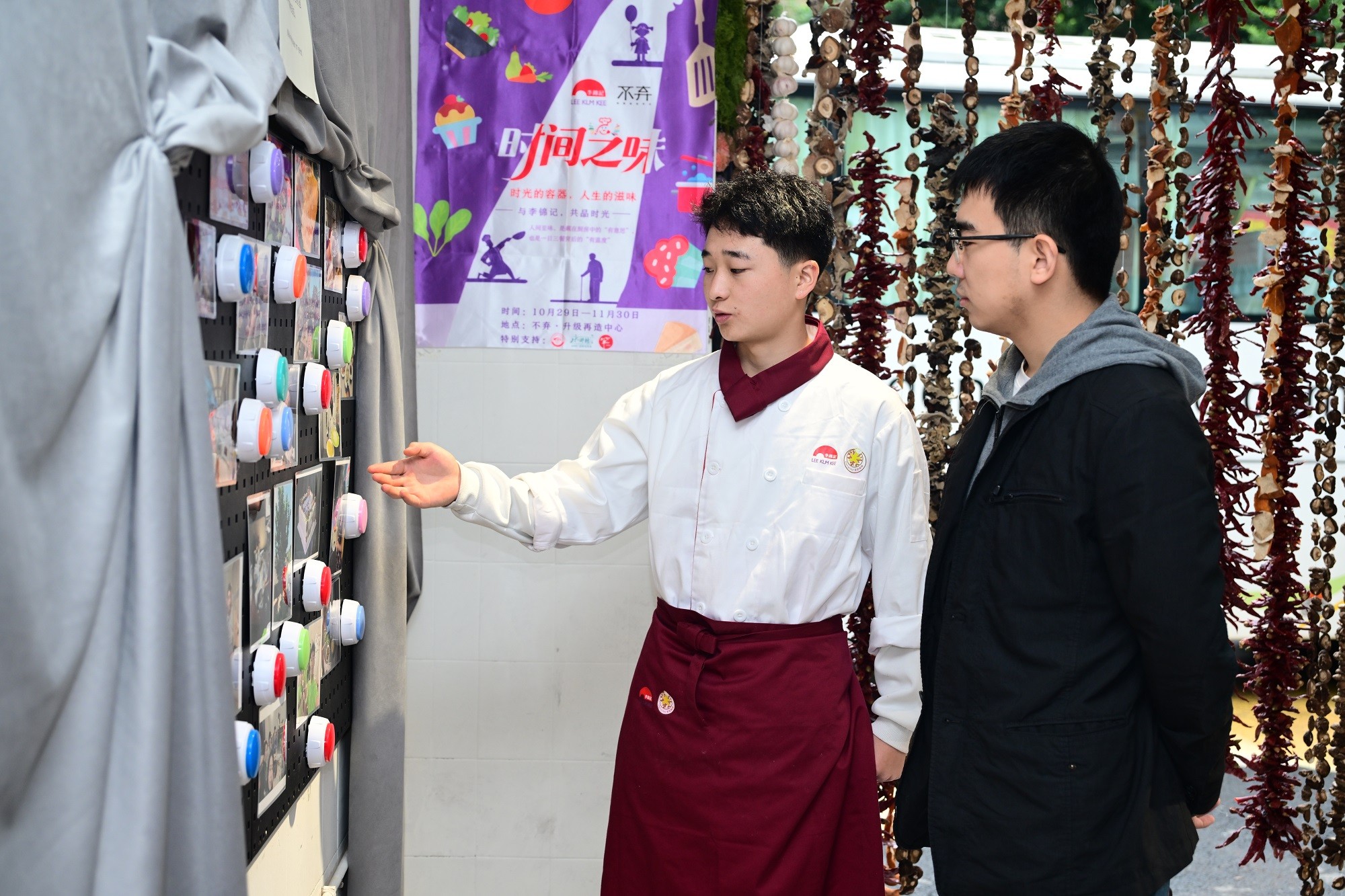 10月29日,成都高新区兴蓉社区的“食物门帘”吸引了不少来来往往的人群,“这是卖干货的吗?”“香菇多少钱?”“为什么有一串串食材?”此起彼伏的疑问声时而响起——这其实是一场关于厨房、关于食物的“时光之味”展,由李锦记可持续“李”想计划联合不弃升级再造中心打造,在成都财贸职高、孔干饭的支持下,希望能以厨房为道场,以食物为媒介,向公众传递“有意思、有温度的厨房”可持续概念。