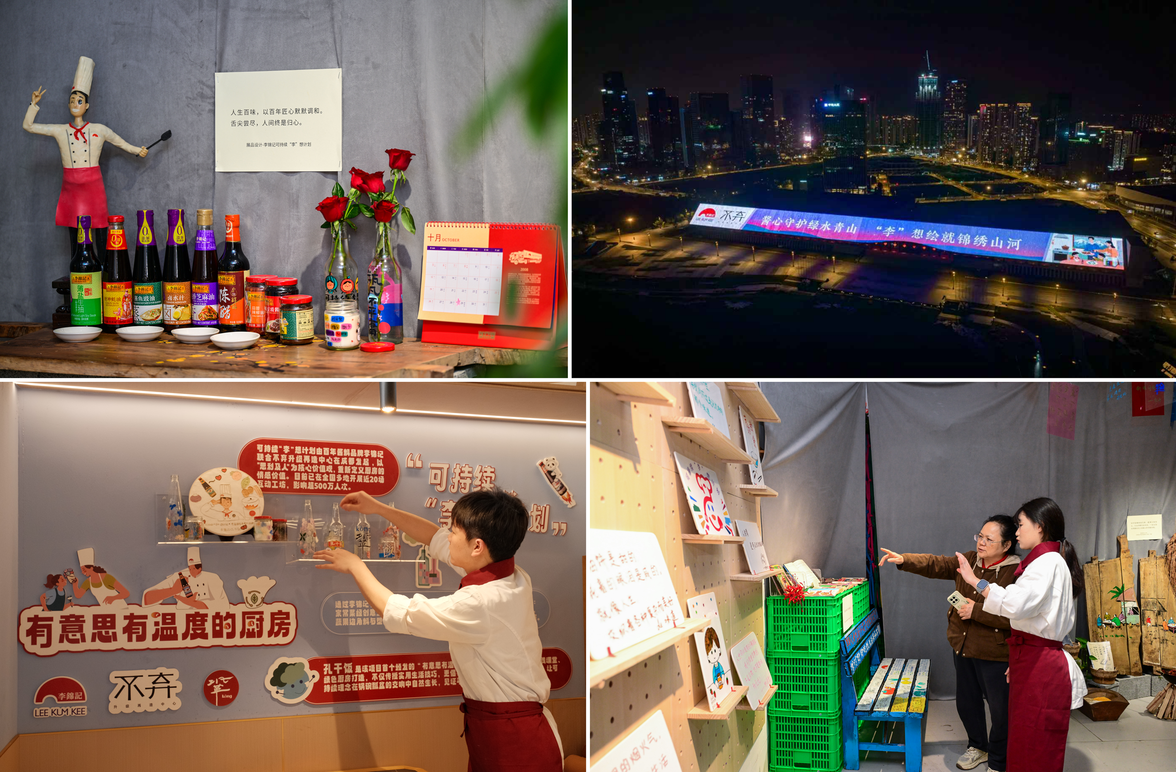 于是,可持续“李”想计划中的首个“有意思、有温度的厨房”样本在成都孔干饭餐厅(东郊记忆店)落地;首批包括中国烹饪大师、餐饮企业代表、李锦记希望厨师和经销商代表在内的6位品牌挚友队伍诞生;首个与社区居民共创的“健康菜谱+老板凳焕新”活动启动;第一个可持续“李”想计划社区展“时间之味”开展;成都的地标建筑“天府大屋檐”也首次被项目宣言点亮……