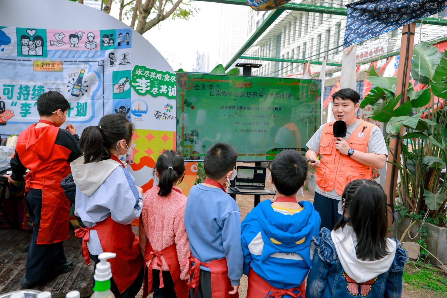 图:李锦记希望厨师王成浩(上)和志愿者向孩子们科普厨房中的水节约和全食概念
